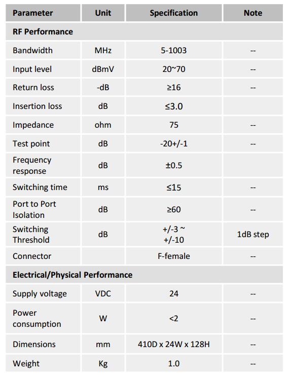 The GSDT-RSW-21 is a 3u rack mount, A/B Style RF switch. The Model automatically switches from the primary RF source to the secondary RF source whenever the primary source is interrupted. The user can set the threshold criteria to decide when a switch occurs. After a switch has occurred, when the primary source again exceeds the user-defined threshold, normal (un-switched) operation is resumed. An alarm informs the user when either the primary or secondary input levels fall below the preset limit.